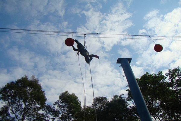 學(xué)員爬上7米高的跳臺,在跳臺上奮力跳出拍打汽球。這個項目主要訓(xùn)練學(xué)員克服心理障礙、建立良好的心理素質(zhì)及自信心,果斷的